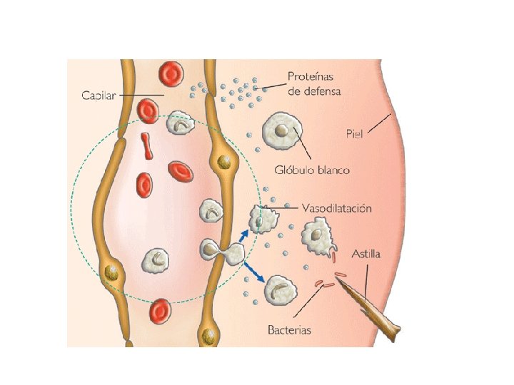 La inflamación. Respuesta secundaria • • • La inflamación se debe a un aumento de la permeabilidad capilar , que permite al plasma sanguíneo escaparse de los capilares al tejido intersticial. Produciendo inflamación o EDEMA. El enrojecimiento ( eritema), se produce como consecuencia del incremento de flujo sanguíneo a la zona afectada. Otros efectos de la respuesta inmune secundaria, son calor local y dolor. La sangre trae a la zona afectada gran cantidad de células fagocíticas que hacen su labor. Esto a veces se evidencia por la aparición de Pus( suero+bacterias muertas+globulos blancos muertos)