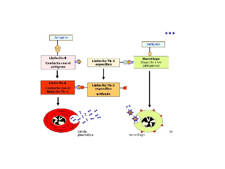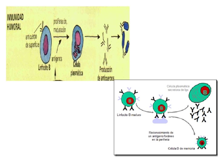 9. RESPUESTA INMUNE HUMORAL • PROCESO. Realizada por los anticuerpos producidos por los linfocitos B. Al entrar el antígeno en el organismo, acaba encontrándose con el linfocito que muestra en su superficie el anticuerpo. El linfocito se activa y proliferan dos tipos de células: - Células plasmáticas: Fabrican Ig M que liberan al medio. Se sitúan en la corteza de los ganglios linfáticos y no salen de ellos, pero si salen las Ig. M que fabrican. - Células memoria: Los linfocitos B se transforman en células memoria que tienen la capacidad de reconocer inmediamente el antígeno y fabricar anticuerpos. Las células memoria proliferan y fabrican nuevas células memoria y células plasmáticas que fabrican Ig G. Permanecen durante largo tiempo y así hay inmunidad duradera contra el patógeno.