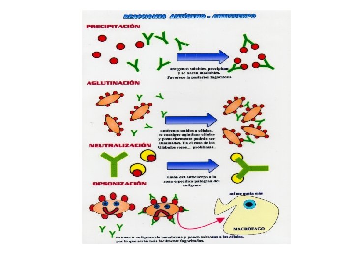 - AGLUTINACIÓN. Los anticuerpos se encuentran con los antígenos de la superficie de células. Se forman agregados celulares rodeados de anticuerpos, que precipitan y son reconocidos por las células fagocitarias.
