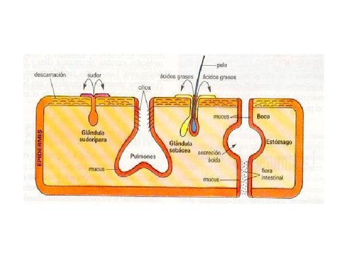 2. BARRERAS PRIMARIAS • MECANISMOS FÍSICOS Efecto barrera de las células epiteliales al estar muy juntas. Efecto barrera de los cilios del epitelio respiratorio, flujos de aire del aparato digestivo y otros fluidos como en el aparato genitourinario. Exoesqueleto de artrópodos, concha de moluscos Pared celular y cutícula en células vegetales. • MECANISMOS QUÍMICOS Ácidos grasos de la piel, sudor y lágrimas Sustancia que modifican el p. H, como en el estómago y la vagina. Enzimas que rompen la pared bacteriana. • MECANISMOS BIOLÓGICOS. Flora bacteriana que compite con los patógenos por los nutrientes y su habitat.