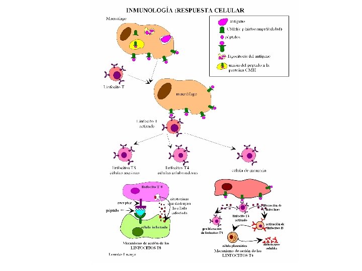 Los linfocitos T tienen en su membrana unos receptores TCR que reconocen el antígeno. Los linfocitos T se activan y se diferencian en cuatro tipos de células. - Linfocitos T citotóxicos (CD 8)que se fijan sobre los Ag de las células y las destruyen al liberar proteínas como: - Citocinas: que impiden la replicación de los virus -Citotoxinas: que degradan la membrana celular -Linfocinas como el interferón, que activan a los macrófagos -Linfocitos T colaboradores (CD 4)que activan la proliferación de linfocitos citotóxicos y L B, estos se transforman en células plasmáticas desencadenando la respuesta humoral. -Linfocitos T supresores que inhiben a los linfocitos colaboradores ( cuando la infección se ha resuelto) -Células memoria: algunos linfocitos T activados que permanecen en el tejido linfático como células de memoria. Se mantienen durante años y si el patógeno vuelve a invadir el organismo lo neutralizan sin permitir que se de la infección.