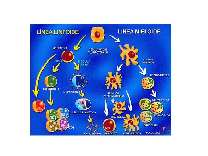 • CÉLULAS LÍNEA MIELOIDE (respuesta inespecífica) - - - GRANULOCITOS Presentan numerosos gránulos y un núcleo lobulado. Suponen el 65% de los glóbulos blancos. Neutrófilos que fagocitan bacterias y las digieren con lisozimas. Eosinófilos y los basófilos intervienen en procesos inflamatorios y en reacciones alérgicas. MONOCITOS. MACRÓFAGOS. Los monocitos son glóbulos blancos de núcleo grande que se encuentran en la sangre y cuando emigran a los tejidos linfoides se transforman en macrófagos. Los Macrófagos son fagocitos que actúan como APC ( células presentadoras de antígeno) MASTOCITOS. CÉLULAS CEBADAS. Son células que se encuentras en mucosas y producen histamina en los procesos alérgicos