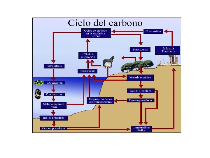 • CICLO CEL CARBONO - - Se incorpora a partir del CO 2 atmosférico o del disuelto en el agua mediante la fotosíntesis que se transforma en moléculas orgánicas. (biologico) La materia orgánica de los productores pasa a los consumidores. ( bio) Los seres vivos degradan la materia orgánica en la respiración aeróbia y devuelven el C 0 2 a la atmósfera o al agua. ( Bio) Parte del carbono se acumula en la corteza y se transforma durante largo tiempo y con las condiciones adecuadas en combustibles fósiles que en los procesos de combustión devuelven el C 02 a la atmósfera. ( biogeoquímico) Las erupciones volcánicas también expulsan C 0 2 a la atmósfera. ( Biogeo qui Algunos animales marinos usan el C 02 del agua en la formación de sus esqueletos de carbonato cálcico. Estos al morir precipitan las sales y forman las rocas calizas, que pueden emerger al exterior por algún proceso. ( Biogeo)