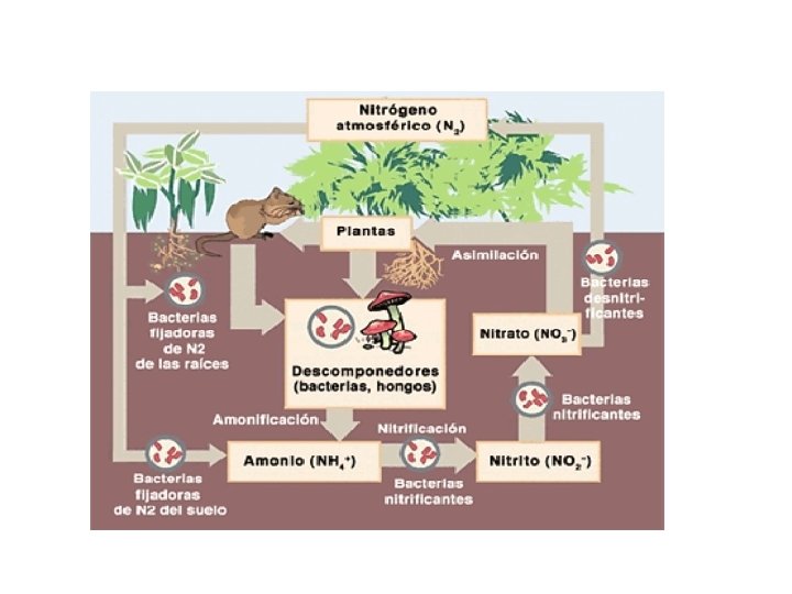 - - Nitrificación Proceso de transformación del amoniaco en nitritos y nitratos. Nitrosación: Las bacterias nitrosomas transforman el amoniaco en nitritos 2 NH 3 + 3 O 2 2 H + + 2 NO 2 - + 2 H 2 O Nitrificación: Las bacterias nitrobacter transforman los nitritos en nitratos 2 NO 2 + O 2 2 NO 3 Las plantas captan los nitritos y nitratos que posteriormente permiten el paso de nitrógeno a los consumidores. Al morir los seres vivos sus restos orgánicos pueden sufrir el proceso de amonificación y transformarse en amoniaco.
