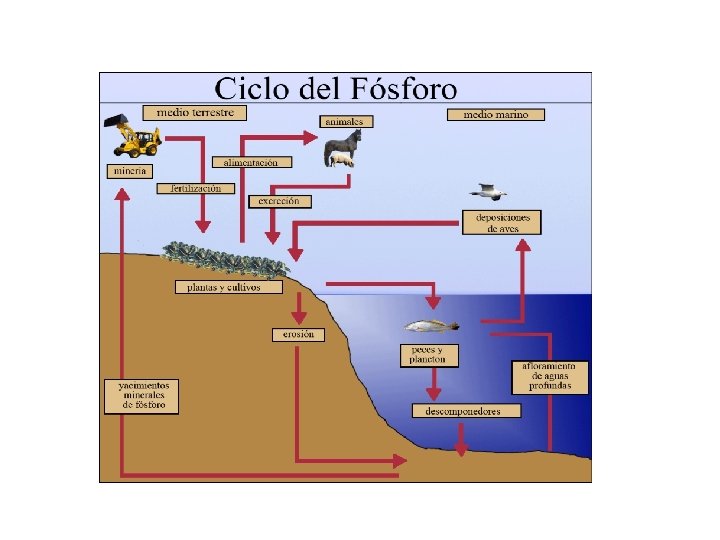 • CICLO DEL FÓSFORO - - El fósforo no tiene fase gaseosa, por tanto no se puede tomar del aire. El fósforo se encuentra acumulado en las rocas en forma de fosfatos, y por erosión es disuelto en el agua del suelo y de las acumulaciones de agua. De aquí pasa a las plantas y alos animales al consumirlas para sus esqueletos y otras moléculas fundamentales. Los fosfatos pueden obtenerse de la minería y utilizarse como abono para las plantas. En el mar la cadena se alarga a las aves que depositan excrementos ricos en fósforo ( guano) que se utiliza como fertilizante. Los restos de fósforo se depositan en los fondos marinos que junto con los restos de esqueletos formando sedimentos ricos en fosfatos. Al cabo de millones de años estos sedimentos pueden quedar en el exterior y sufrir de nuevo el proceso erosivo.