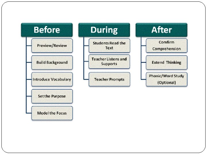 � 2. 1. 4. INTEGRATING READING STRATEGIES � Instructors can help their students to become effective readers by teaching them HOW TO USE READING STRATEGIES before, during and after reading. BEFORE READING: PLAN FOR THE READING TASK. • Set a purpose/ decide what to read • Linguistic /background knowledge • Top-down or bottom-up strategy DURING AND AFTER READING: MONITOR COMPREHENSION. • Verify predictions/check for inaccurate guesses • What is important to understand • Reread to check comprehension • Ask for help. • AFTER READING: EVALUATE COMPREHESION AND STRATEGIES USED. • Comprehension in a particular task • Overall progress in reading and in particular types of reading tasks • Evaluate the strategies used and modify them if necessary