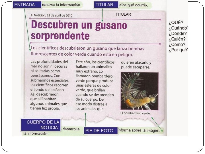 El texto periodístico � 3. LA ORGANIZACIÓN Y EL DISEÑO DEL PERIÓDICO �El periódico se organiza atendiendo a los siguientes criterios: �A- LA PORTADA: es lo más importante y aparece la información resumida �B-La parte superior de las páginas IMPARES recoge los más significativo por una cuestión óptica �C-El número de columnas es proporcional a la importancia �D- Las IMÁGENES acompañan al texto