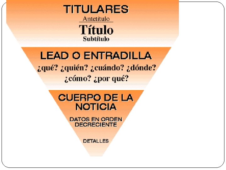 El texto periodístico � 2. LOS GÉNEROS PERIODÍSTICOS Según la INTENCIÓN comunicativa podemos señalar : a) GÉNEROS INFORMATIVOS En ellos predomina la información OBJETIVA , y los dos principales géneros son : 1 -LA NOTICIA: informa de manera sencilla sobre un hecho actual. Podemos distinguir tres partes: el titular, la entradilla o lead y el cuerpo de la noticia. 2. EL REPORTAJE: es una ampliación de la noticia, se entra en un análisis más profundo de la noticia. 3. LA ENTREVISTA : plasma la conversación entre un periodista y una persona importante.