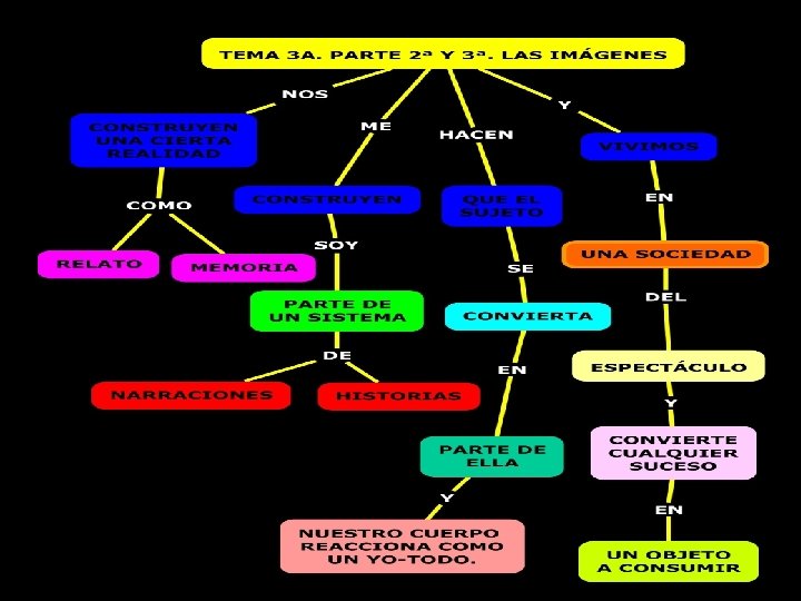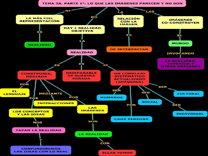 ACTIVIDADES 1. Hemos hablado sobre que la realidad está mediada por el lenguaje, las ideas, la cultura, etc. pero sobre todo por las imágenes ¿Por qué? ¿media la realidad que tú vives? Las realidad está mediada por la cultura, ideas, lenguaje, las imágenes etc. porque vemos a través de ellas. Esta realidad que nos muestra es objetiva y construida pero debemos tener en cuenta que es sólo una parte de una determinada realidad elaborada por alguien, que quizás no piense igual que nosotros, pues se debe tener en cuenta tanto su ser social, como cultural, individual y humano. Además tanto las ideas, como la cultura, como las imágenes, etc. están en continuo cambio y lo que en el siglo XVIII era realidad hoy no lo es. Esa realidad mediada, no nos hace avanzar pues nos muestra la realidad de alguien ¡ojo!, no la nuestra. No debemos fiarnos, todo lo que vemos o escuchamos, etc. no es lo real.