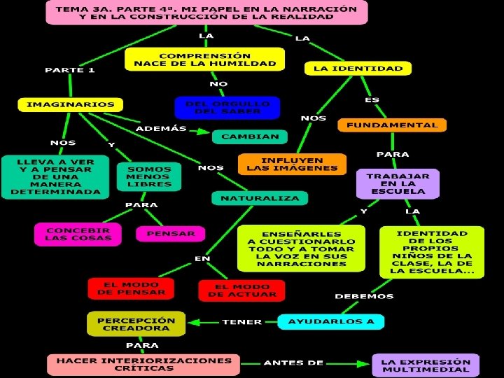 2. ¿Cómo intervienen las imágenes en el proceso de construcción de nuestra identidad? Las imágenes se alimentan de los imaginarios de cada época. Estas imágenes intervienen de una manera muy importante en nuestra identidad, pues hacen que lo que vemos sea lo correcto y lo natural. Nos muestran modelos, patrones, hábitos, formas de actuar, etc. las cuales seguimos fielmente pues nos lo muestra como lo correcto, lo bueno, lo natural, lo sano, ect. Por lo tanto es necesario que tanto nosotros como nuestros alumnos formemos con una identidad sana y constructiva. Para ello necesitamos reflexionar sobre quiénes somos y por qué. También debemos decir que no todas las imágenes nos perjudican, hay muchas que nos transmiten felicidad y nos benefician de algún modo.