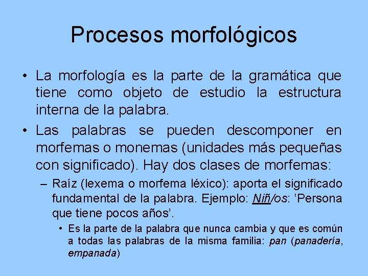 Procesos morfológicos • La morfología es la parte de la gramática que tiene como objeto de estudio la estructura interna de la palabra. • Las palabras se pueden descomponer en morfemas o monemas (unidades más pequeñas con significado). Hay dos clases de morfemas: – Raíz (lexema o morfema léxico): aporta el significado fundamental de la palabra. Ejemplo: Niñ/os: ʽPersona que tiene pocos añosʼ. • Es la parte de la palabra que nunca cambia y que es común a todas las palabras de la misma familia: pan (panadería, empanada)