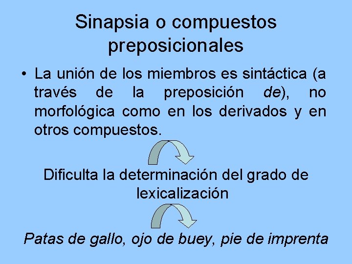 Sinapsia o compuestos preposicionales • La unión de los miembros es sintáctica (a través de la preposición de), no morfológica como en los derivados y en otros compuestos. Dificulta la determinación del grado de lexicalización Patas de gallo, ojo de buey, pie de imprenta