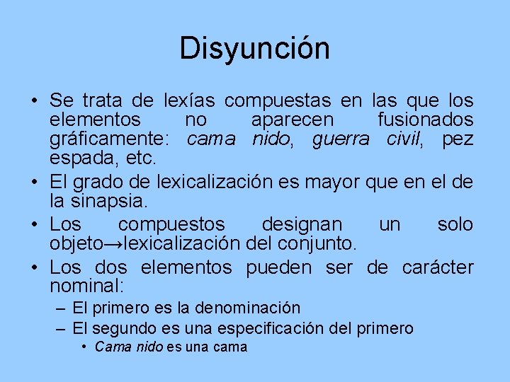 Disyunción • Se trata de lexías compuestas en las que los elementos no aparecen fusionados gráficamente: cama nido, guerra civil, pez espada, etc. • El grado de lexicalización es mayor que en el de la sinapsia. • Los compuestos designan un solo objeto→lexicalización del conjunto. • Los dos elementos pueden ser de carácter nominal: – El primero es la denominación – El segundo es una especificación del primero • Cama nido es una cama