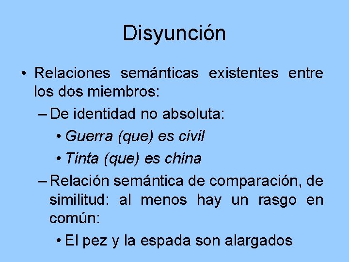 Disyunción • Relaciones semánticas existentes entre los dos miembros: – De identidad no absoluta: • Guerra (que) es civil • Tinta (que) es china – Relación semántica de comparación, de similitud: al menos hay un rasgo en común: • El pez y la espada son alargados