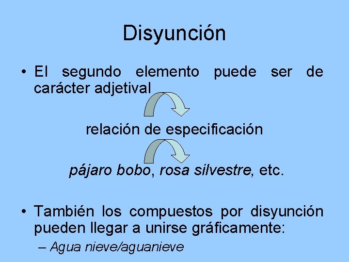 Disyunción • El segundo elemento puede ser de carácter adjetival relación de especificación pájaro bobo, rosa silvestre, etc. • También los compuestos por disyunción pueden llegar a unirse gráficamente: – Agua nieve/aguanieve