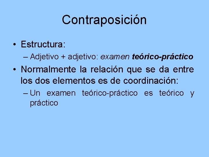 Contraposición • Estructura: – Adjetivo + adjetivo: examen teórico-práctico • Normalmente la relación que se da entre los dos elementos es de coordinación: – Un examen teórico-práctico es teórico y práctico