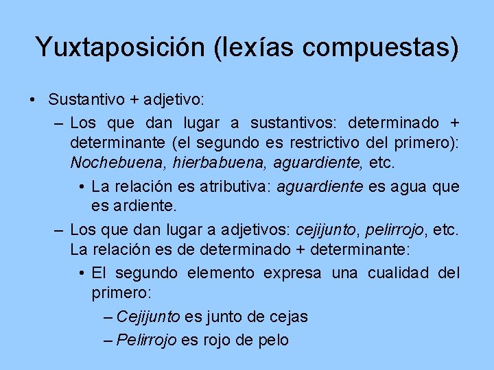 Yuxtaposición (lexías compuestas) • Sustantivo + adjetivo: – Los que dan lugar a sustantivos: determinado + determinante (el segundo es restrictivo del primero): Nochebuena, hierbabuena, aguardiente, etc. • La relación es atributiva: aguardiente es agua que es ardiente. – Los que dan lugar a adjetivos: cejijunto, pelirrojo, etc. La relación es de determinado + determinante: • El segundo elemento expresa una cualidad del primero: – Cejijunto es junto de cejas – Pelirrojo es rojo de pelo