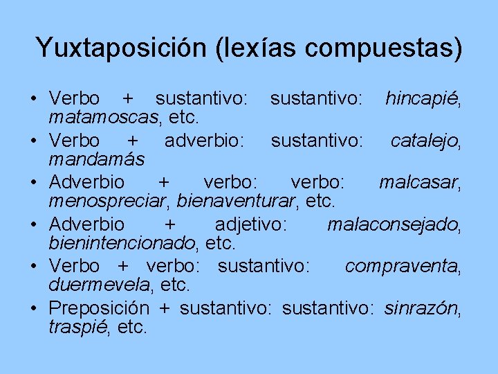 Yuxtaposición (lexías compuestas) • Verbo + sustantivo: hincapié, matamoscas, etc. • Verbo + adverbio: sustantivo: catalejo, mandamás • Adverbio + verbo: malcasar, menospreciar, bienaventurar, etc. • Adverbio + adjetivo: malaconsejado, bienintencionado, etc. • Verbo + verbo: sustantivo: compraventa, duermevela, etc. • Preposición + sustantivo: sinrazón, traspié, etc.