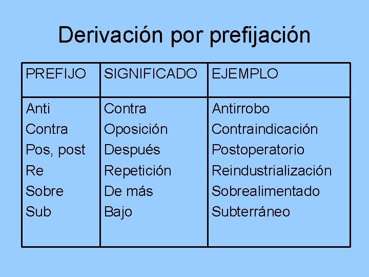 Derivación por prefijación PREFIJO SIGNIFICADO EJEMPLO Anti Contra Pos, post Re Sobre Sub Contra Oposición Después Repetición De más Bajo Antirrobo Contraindicación Postoperatorio Reindustrialización Sobrealimentado Subterráneo