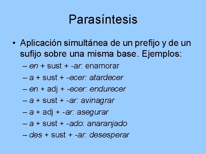 Parasíntesis • Aplicación simultánea de un prefijo y de un sufijo sobre una misma base. Ejemplos: – en + sust + -ar: enamorar – a + sust + -ecer: atardecer – en + adj + -ecer: endurecer – a + sust + -ar: avinagrar – a + adj + -ar: asegurar – a + sust + -ado: anaranjado – des + sust + -ar: desesperar