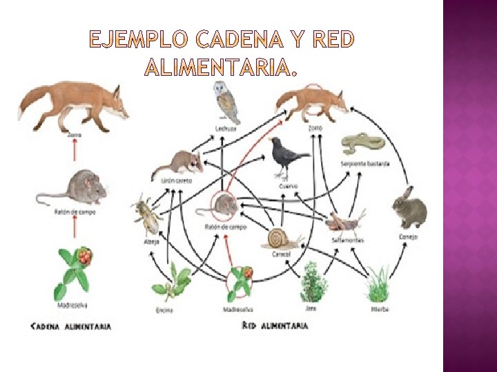 � Cadena alimentaria: las relaciones de alimentación entre las especies de un ecosistema. � Red alimentaria: Representaciones en forma de red que combinan varias cadenas alimentarias.