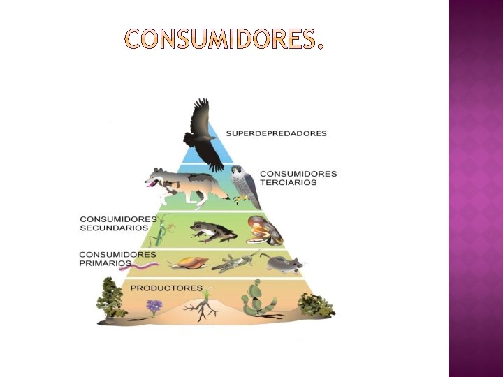 � Los animales consiguen su alimento a partir de otros seres vivos. Por eso, se les llama consumidores. � Tipos de consumidores: � Primario. Animales herbívoros que se alimentan de plantas. � Secundario. Animales carnívoros que se alimentan de herbívoros. � Terciario. Otros animales carnívoros que se alimentan de los consumidores secundarios. � Otros tipos de consumidores. � Depredadores. Animales carnívoros que cazan a otros animales. � Carroñeros. Se alimentan de cadáveres. � Parásitos. Se alimentan de otros animales, sin matarlos.
