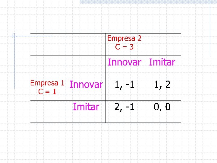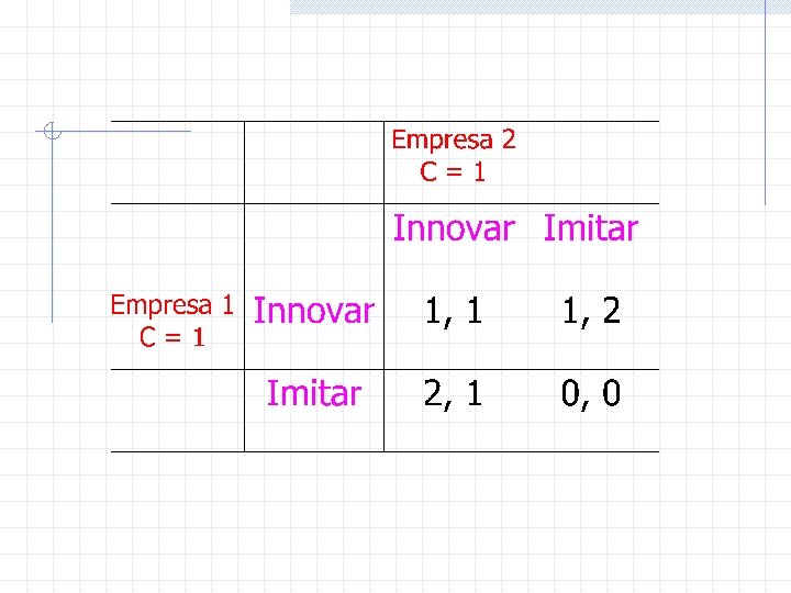 Consideraremos el caso más simple de dos jugadores. · El conjunto de jugadores, en el caso bipersonal, En el ejemplo anterior, los jugadores son la empresa 1 y 2. · El conjunto de acciones disponibles para el jugador i, Ai. El conjunto de acciones del jugador 1 , A 1 : {Innovar, Imitar} y el conjunto de acciones del jugador 2 , A 2 : {Innovar, Imitar}
