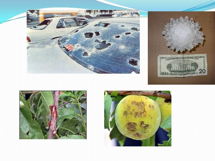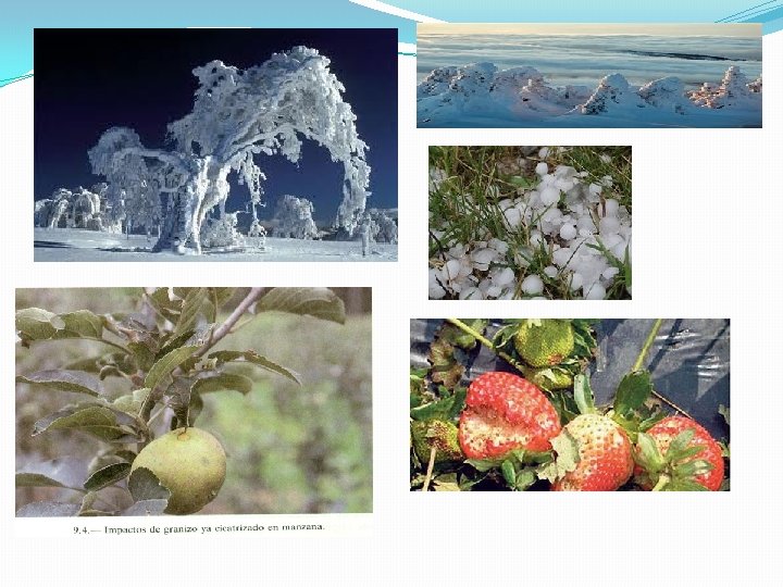 Nieve: se forma comúnmente cuando el vapor de agua experimenta una alta deposición en la atmósfera a una temperatura menor de 0 °C. Provoca sobrecarga mecánica y congelamiento, aunque tiene funciones beneficiosas: templa los fríos intensos, aporta humedad al suelo, evita que el suelo se congele en profundidad. Granizo: precipitación de hielo traslucido, casi siempre esférico. Pedrisco: precipitación de hielo traslucido, de forma mas irregular. Se asocian con tormentas, sus efectos se agravan con vientos fuertes. Provocan heridas de impacto en hojas y frutos, e incluso en la madera.