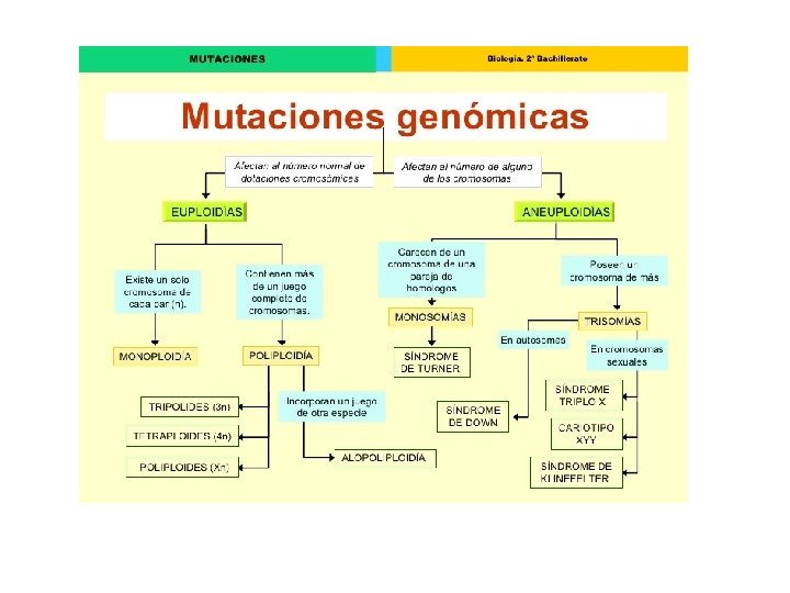 • 6. - MUTACIONES – 6. 1. DEFINICIÓN: Cambios inesperados, ocurridos de forma aleatoria en el material genético, que solo se transmiten a la descendencia si afectan a los gametos (vídeo) – 6. 2. TIPOS • 6. 2. 1. Según las células afectadas: SOMÁTICAS Y SEXUALES • 6. 2. 2. Según las causas: ESPONTÁNEAS E INDUCIDAS POR AGENTES MUTÁGENOS • 6. 2. 3. Según los efectos: POSITIVAS( evolución —>biodiversidad), NEGATIVAS o NEUTRAS • 6. 2. 4. Según los alelos resultantes: DOMINANTES O RECESIVAS • 6. 2. 5. Según la alteración que producen: GÉNICAS, CROMOSÓMICAS Y NUMÉRICAS O GENÓMICAS – 6. 3. CAUSAS. • Pueden ser producidas por AGENTES MUTAGÉNICOS » FÍSICOS: Radiaciones (Rayos X y procesos radiactivos, incluida la radiación solar) » QUÍMICOS: Colorantes, pesticidas, contaminantes. Por ejemplo el humo del tabaco » BIOLÓGICOS: Algunos virus