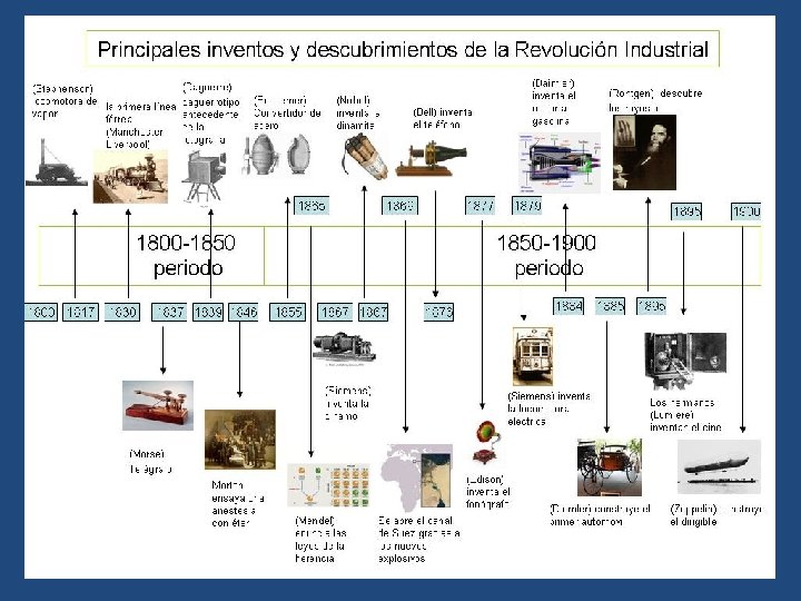 d) Las nuevas fuentes de energía. • La segunda revolución industrial se caracterizó por la aparición de dos nuevas formas de energía: la electricidad y el petróleo. – La electricidad ya se conocía, pero el reto era producirla en cantidades industriales y resolver el problema de su transporte. Los progresos de la Física lo hicieron posible. Sus aplicaciones fueron múltiples: alumbrado (en 1878, Edison presenta su lámpara de filamento o incandescente), sistemas de comunicaciones (telégrafo, teléfono y radio) y de transporte (ferrocarril, tranvías eléctricos o el “metro”), ascensores, grúas, etc.