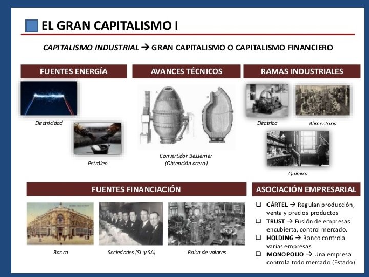 b) Las transformaciones empresariales • La aplicación de todos los avances tecnológicos a la producción industrial va a requerir fuertes inversiones de capital que no todas las empresas podrán realizar, se va a producir así una serie de transformaciones empresariales para adaptarse a las nuevas necesidades del mercado y ser más competitivas. Esta fase, conocida como gran capitalismo, se va a caracterizar por la concentración empresarial y financiera.