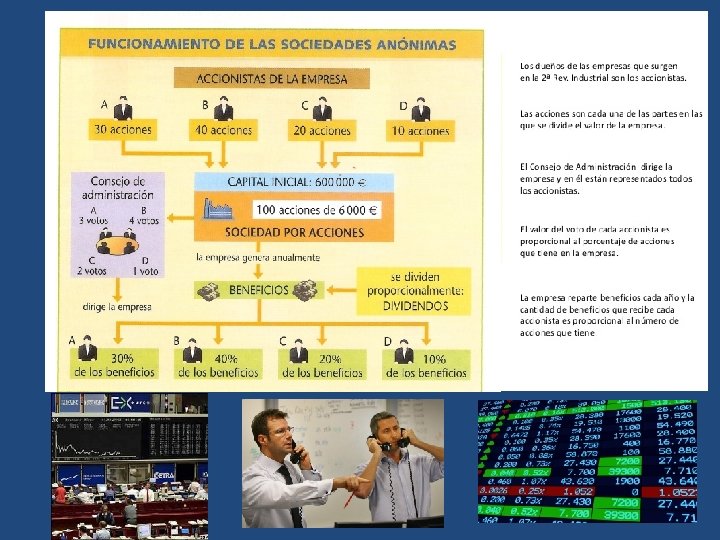 a) Las nuevas fuentes de financiación. La necesidad de invertir enormes cantidades de capital para poner en marcha, renovar o mantener las industrias obligó a los empresarios a buscar nuevas fuentes de financiación: – Las sociedades anónimas, empresas formadas por la suma de capitales individuales. Cada socio poseía participaciones (acciones) y obtenía la parte proporcional que le correspondía de los beneficios o las pérdidas. – Muchas empresas se financiaban emitiendo acciones que se compraban y se vendían en la bolsa, surgen así las sociedades por acciones en las que el dueño no es una sola persona sino la que posee la mayor parte de las acciones.