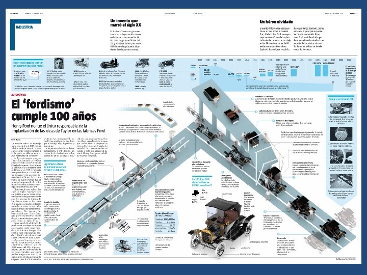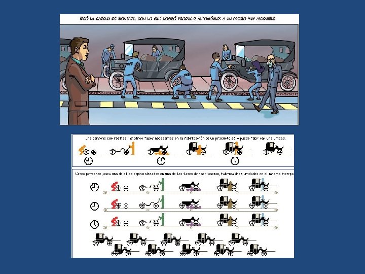 a) La nueva organización del trabajo • La consolidación del gran capitalismo originó transformaciones en la organización del trabajo (fordismo y el taylorismo). Nuevos métodos que afectaron tanto a la producción (fabricación de productos en serie) como al trabajo (sistema de producción en cadena). En la producción en cadena cada obrero se especializaba en una tarea concreta (colocar una tuerca, atornillar…) para ahorrar tiempo y fabricar una mayor cantidad de productos. El fordismo, que recibe el nombre del fabricante de automóviles H. Ford, se basa en la producción industrial en serie. http: //socialesiesae. blogspot. com. es/2 016/11/1 bach-la-revolucionindustrial. html