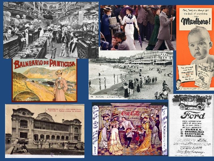 b) El nacimiento de la sociedad de consumo • Como consecuencia del aumento de la producción industrial surgió la sociedad de consumo desarrollándose una mentalidad en la que primaba el bienestar material. • Las empresas utilizaron nuevas técnicas para fomentar las ventas como la publicidad. • En EE. UU. surgirán los primeros grandes almacenes con sus rebajas y la compra a plazos. La publicidad alcanzó un desarrollo importante ya que las empresas utilizaron los anuncios de la prensa y los carteles para dar a conocer sus productos querían vender. También, en esta época, nacerá el diseño con el objetivo de dar un aspecto atractivo a los productos para facilitar su venta.