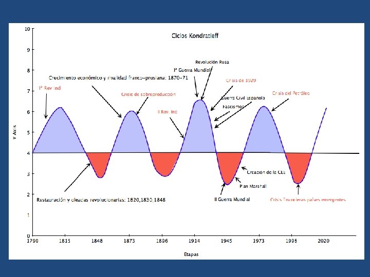 c) La crisis y los ciclos económicos • Con la consolidación del gran capitalismo surgieron también las crisis económicas producidas por un exceso de productos que el mercado no podía consumir, es decir, por un desequilibrio entre la oferta y la demanda. • La alternancia de períodos de expansión económica con otros de crisis en los que el desempleo castigaba muy duramente a los trabajadores se convertirá en un rasgo característico del capitalismo.