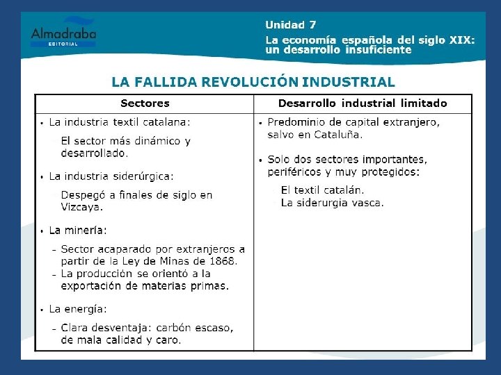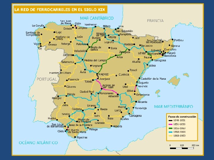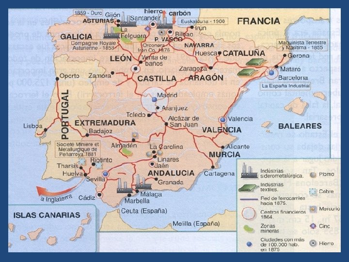 g) España – El desarrollo industrial continuó siendo escaso si lo comparamos con el resto de potencias europeas. – La expansión del ferrocarril sería uno de los pilares básicos sobre los que se sustentó el desarrollo industrial. – Las mayores inversiones extranjeras en España se destinaron a la minería. – Las zonas más industrializadas continuaron siendo: üCataluña, que continuó desarrollando la industrial textil y üPaís Vasco, cuyo desarrollo industrial se basó en la industria siderúrgica (altos hornos)