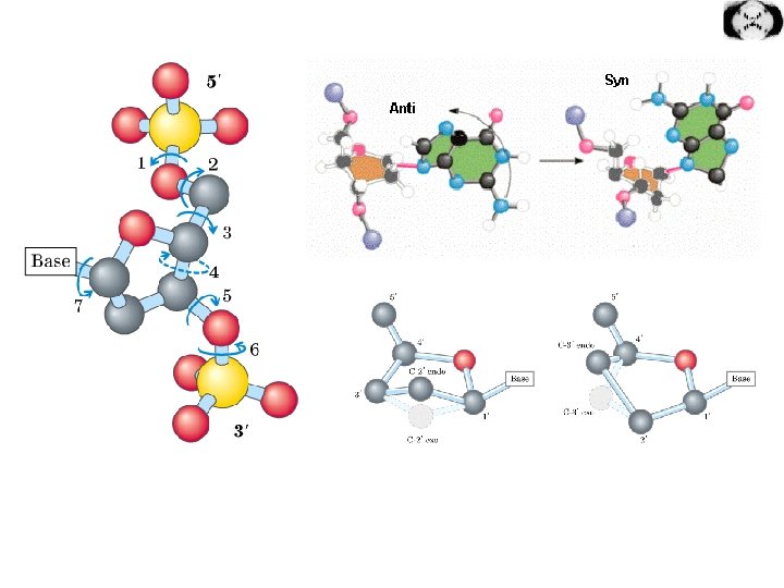 Conformación de desoxirribosa Pirimidinas Purinas Conformación del enlace glicosídico: sym purinas anti pirimidinas Apareamiento de bases Giro a izquierdas