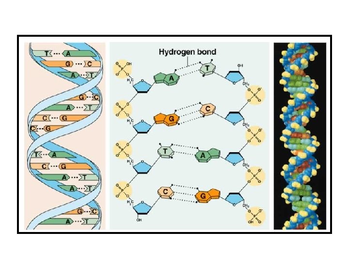 - Estructura de la doble hélice. Watson y Crick en 1953 basándose en los estudios de Wilkins, Franklin y Chargaff proponen esta estructura. Formada por dos cadenas o hebras antiparalelas. Una en sentido 5´- 3´y la otra en sentido contrario 3´- 5´ Las hebras se encuentran enrolladas hacia la derecha( sentido dextrógiro) conteniendo cada vuelta 10 nucleótidos. Las bases quedan orientadas hacia el interior y se unen entre ellas por puentes de H. Siempre entre una base púrica y una pirimidínica ( por tamaño) Dos puentes entre A y T y tres puentes entre G y C, por tanto son hebras complementarias y que se pueden desnaturalizar.