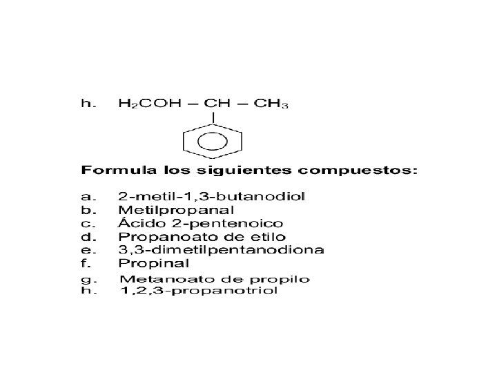 15. NITRILOS. • Una forma de nombrar los nitrilos consiste en añadir la terminación –nitrilo al nombre del hidrocarburo correspondiente. Si es preciso numerar la cadena, se comienza por el grupo funciona. • Ejemplo: CH 3 -C≡N etanonitrilo/acetonitrilo • Nombrar: a) CH 3 -CH 2 -C≡N b) CH 3 -CH(CH 3)-(CH 2)3 -C≡N c) HC≡N d) N≡C-CH 2 -C≡N