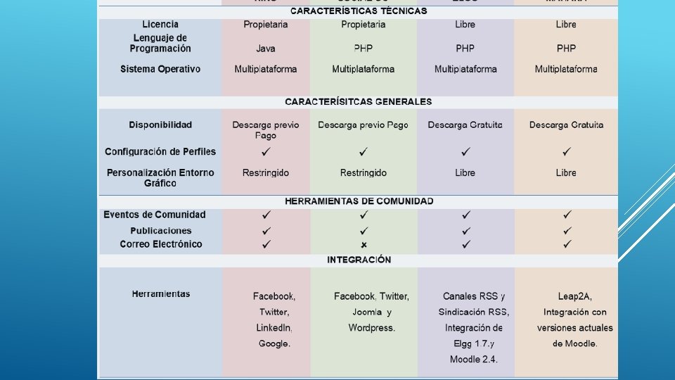 RED SOCIAL MAHARA • Permite la personalización de la red social, por medio de la configuración de vistas. • Posee una variedad de herramientas que facilitan la comunicación entre usuarios. • La herramienta es multiplataforma y el software necesario para la instalación se lo descarga desde su sitio oficial de forma gratuita. • Además de permitir el desarrollo de la red social, la plataforma incluye portafolio electrónico, lo que facilita la integración de herramientas a usar en la Solución Informática Integrada • La red social es compatible con el Sistema de Gestión de Aprendizaje Moodle, de modo que permite el inicio de sesión único entre ambas plataformas.