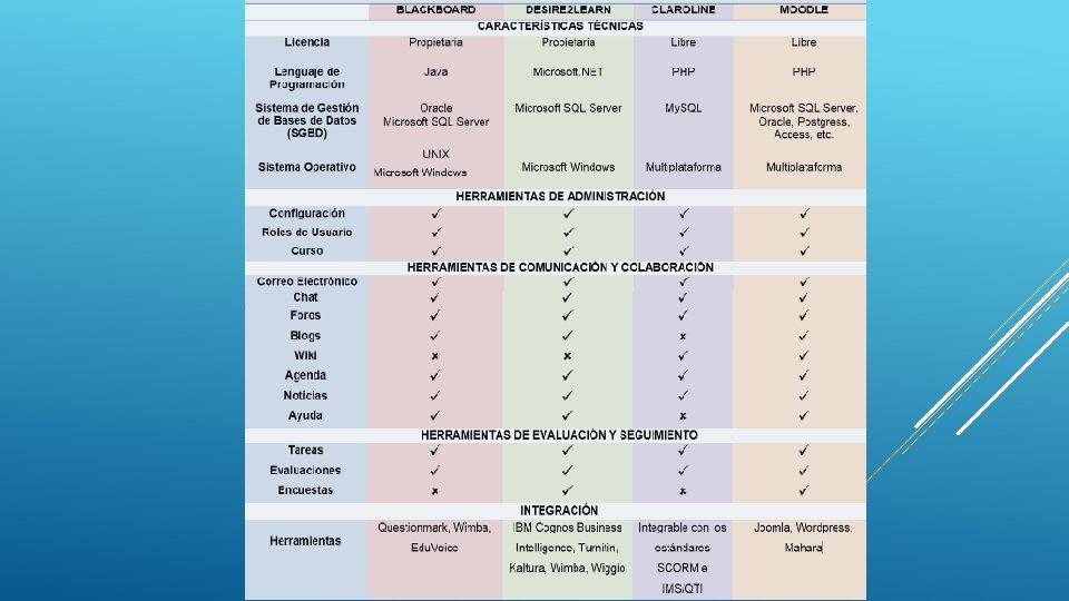 SISTEMA DE GESTIÓN DE APRENDIZAJE MOODLE • Posee herramientas de administración, comunicación, colaboración, evaluación y seguimiento en el proceso educativo. • Tiene licencia de libre distribución, por lo que optimiza recursos y permite la instalación en varias computadoras según las necesidades. • Es un sistema multiplataforma, lo que ayuda a la independencia en cuanto a los requerimientos técnicos. • Es compatible con la herramienta Mahara, por lo que facilita la integración con la Red Social y Portafolio Electrónico.