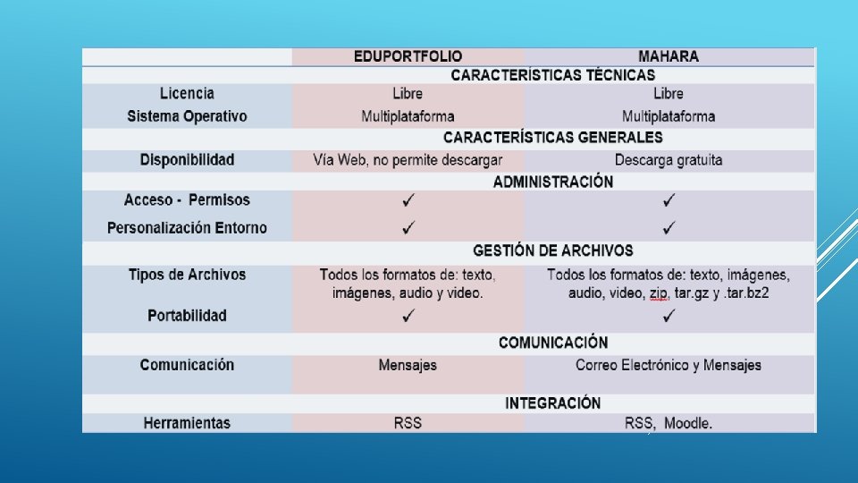 E-PORTFOLIO MAHARA • Tiene una interfaz gráfica sencilla y de fácil uso. • Maneja archivos de distintos formatos de texto, imágenes, audio, video, y compresores. • Facilita una interacción y comunicación entre usuarios, gracias a la Red Social que incluye, teniendo como resultado un mejor aprendizaje colectivo. • Realiza seguimiento a las actividades realizadas por los estudiantes. • Permite la integración con versiones actuales de la herramienta Moodle, lo que facilita la importación y exportación de archivos.