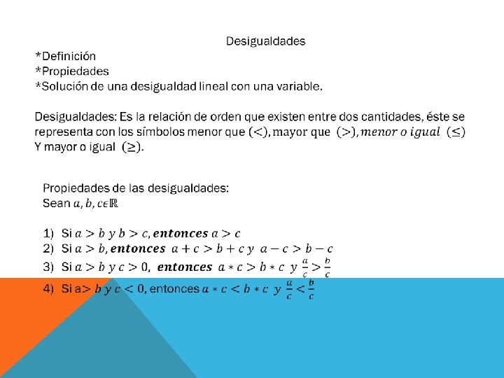 Solución de una desigualdad lineal con una variable: Para determinar el conjunto solución de una desigualdad, se procede de la misma manera como en una ecuación lineal, despejando la variable y tomando en consideración las propiedades de las desigualdades. Resolveremos los ejercicios del libro página 149 Encontrar el conjunto solución de los siguientes ejercicios: