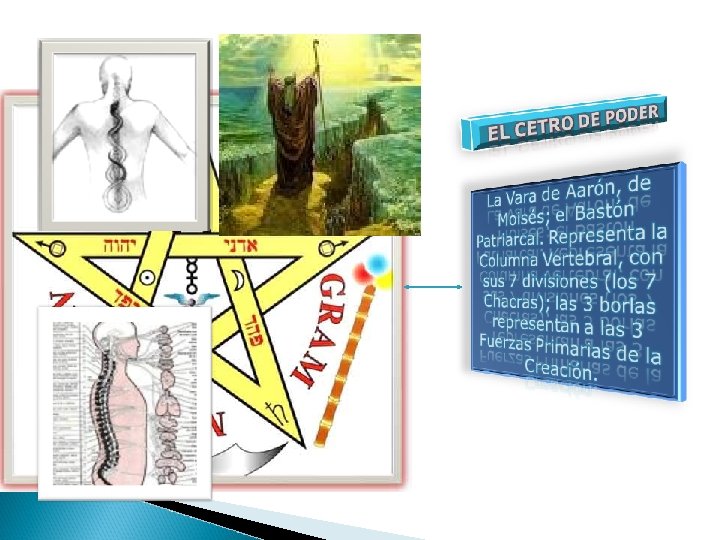 LETRAS EN HEBREO En el brazo derecho encontramos cuatro letras hebreas de derecha a izquierda: IOD-HEH-VAUH-HEH. Se leen JEHOVA. EL SER QUE ES, QUE SIEMPRE HA SIDO, Y QUE SIEMPRE SERA. En el brazo izquierdo tenemos las tres letras hebreas de derecha a izquierda: ALEF, DALEF, MEN. Se leen: ADAM. La Primera RAZA RAIZ. EL ADAM SOLUS. En la pierna derecha tenemos las tres letras hebreas KAF, TAU, RESH. Se leen KETHER. El ANCIANO DE LOS DIAS. En la pierna izquierda tenemos las tres letras hebreas PETH, CHETH, DALETH. Se leen PAJAD, PECHAD. Representan la SEVERIDAD, la JUSTICIA. AMOR y LEY, MISERICORDIA y JUSTICIA.