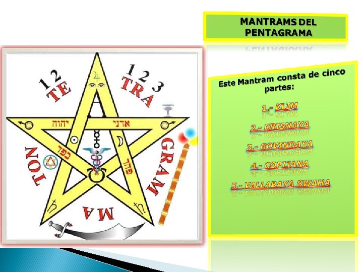 Este poderoso Mantram tiene tres etapas perfectamente definidas: Al pronunciar o recitar el “KLIM”, que los ocultistas de la India llaman la SEMILLA DE ATRACCIÓN, provocamos un influjo de Energía Crística que desciende instantáneamente del mundo del Logos Solar, para protegernos y se abre entonces hacia abajo una puerta misteriosa. Por medio de las tres partes siguientes: “KRISNAYA GOVINDAYA COPIJANA” se infunde la Energía Crística en aquel que la recita. Por medio de la quinta “VALLABAYA SWAHA”, el que ha recibido la Energía Crística puede irradiar con tremenda fuerza para defenderse de los tenebrosos y estos huyen aterrorizados.