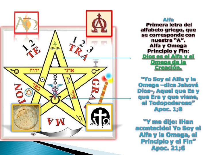 Los Ojos del Espíritu Divino, que todo lo ve. La Omnipresencia de Dios a través de su vigilancia. La representación del concepto “Infinito", tiene una relación formal con el sentido del orden de las letras en el alfabeto griego. Los griegos, según parece, asignaron el primer lugar en su alfabeto a α (alfa) por ser precisamente el lugar que "Dios" merecía en su cosmogonía. De ahí que - según algún maestro de literatura de buena voluntad - todas las palabras griegas cuya letra inicial era esa tenían, de un modo u otro, relación con lo Divino.