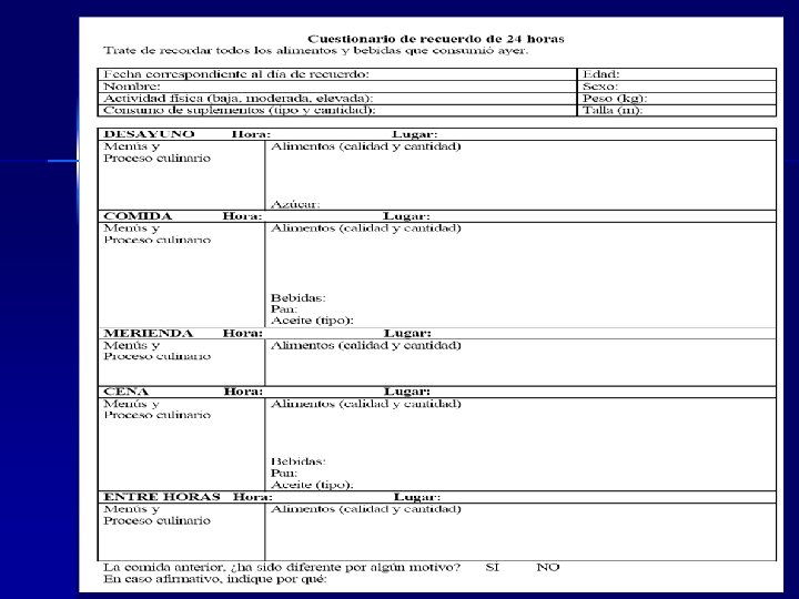 REGISTRO DE LA INGESTA PASADA MEMORIA DIETÉTICA. -RECUERDO 24 h. Se basa en estimar el consumo de los alimentos ingeridos en el período inmediatamente anterior a la entrevista. (Wiehl, 1942). • Dieta • C. corporal • Bioquímicos • Inmunológicos • Clínica n Ventajas n Inconvenientes n Simplicidad y rapidez. n El día anterior a la entrevista n Bajo coste n Personal poco cualificado. n Altas tasas de respuesta. puede ser atípico. n Estimación de las cantidades. Flat slope syndrome. n Dificultad de concretar la ingesta de algunos alimentos.