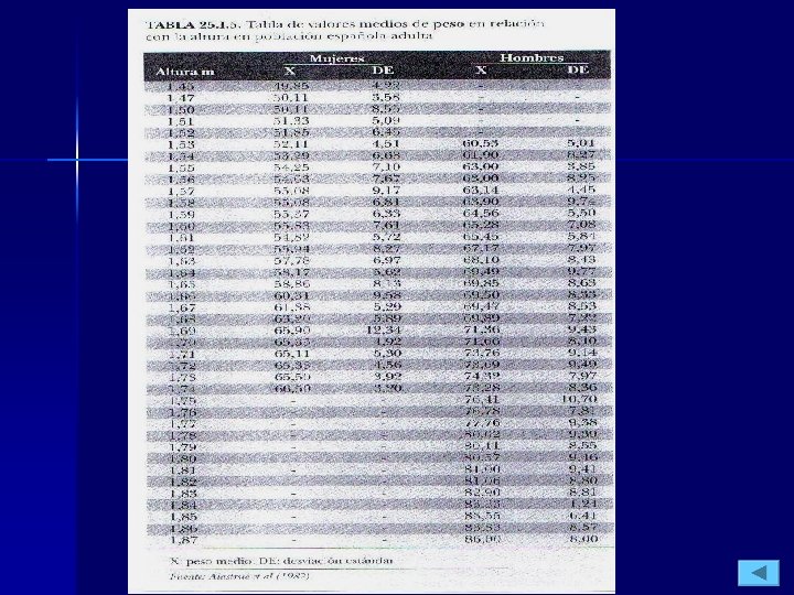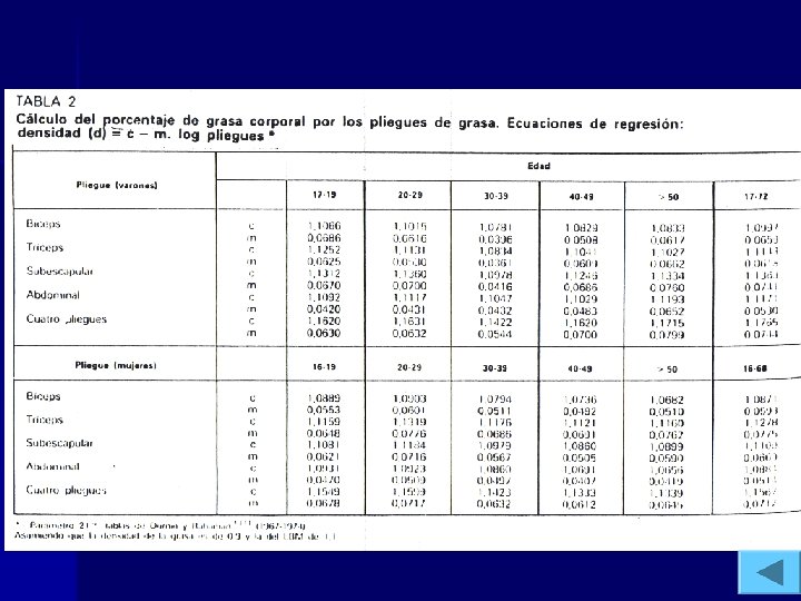 A: 3. -Grasa corporal Pliegues cutáneos *Pliegue tríceps • Dieta • C. corporal *Pligue del bíceps *Pliegue subescapular d= c-m x log Pliegue *Pliegue abdominal • Bioquímicos • Inmunológicos • Clínica % MG= 100 x (4, 95/d - 4, 50) (Siri, W. E. Univ. Calif. Radiat. Lab. Pub. Nº 3349. 1956)