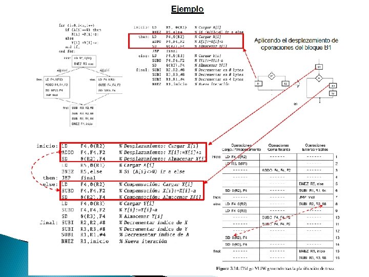 Consideraciones del compilador para desplazar operaciones dentro de una traza � � Conocer cuál es la secuencia de ejecución más probable. Conocer las dependencias de datos existentes para garantizar su mantenimiento. La cantidad de código de compensación que es necesario añadir. Saber si compensa el desplazamiento de operaciones dentro de la traza, midiéndose el coste tanto en ciclos de ejecución como en espacio de almacenamiento.
