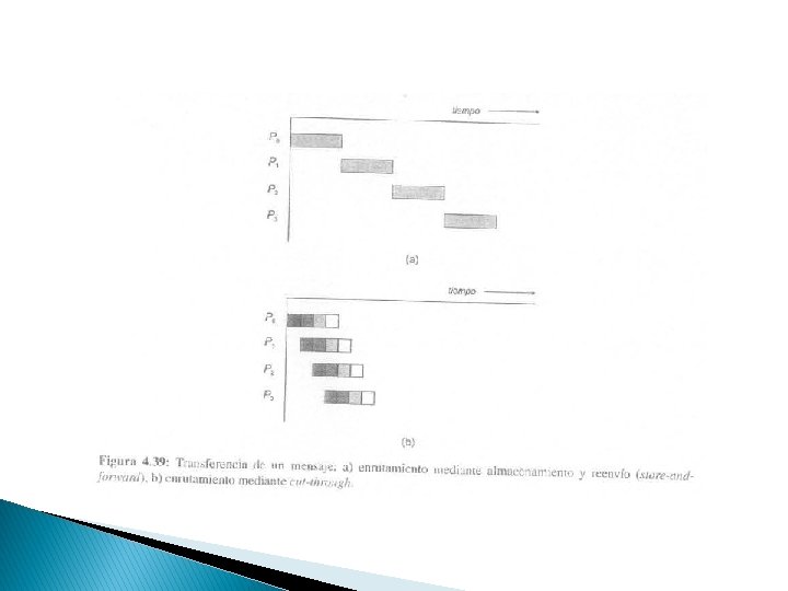 4. 6. 2 Coste de la comunicación mediante paso de mensaje � Latencia en comunicación ◦ Tiempo de iniciación (ts) ◦ Tiempo de salto (Th) ◦ Tiempo de transferencia por palabra (tw) � Almacenamiento y reenvío (store-and-forward) ◦ Cada nodo lo reenvía únicamente cuando lo ha recibido y almacenado completamente � Corte y continuación (cut-through) ◦ Divide cada mensaje en un número fijo de unidades llamados dígitos de control de flujo (flow control digits o flits) ◦ Antes de enviar el primer flits se establece la ruta mediante un paquete denominado tracer